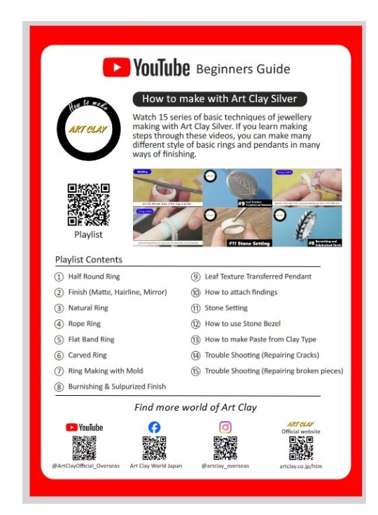 Watch 15 series of basic jewelry making techniques with Art Clay silver. If you learn the steps with these videos, you can make many different styles of basic rings and pendants in many ways of finishing.