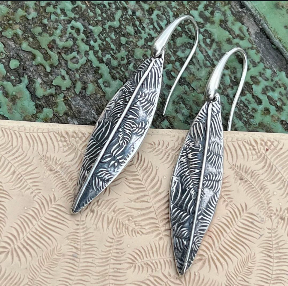 Lange wat grotere oorhangers met een blad textuur. Textuur verkregen met een textuurmatje. Wel even licht Coolslip sprayen op het textuurmatje als anti plak. Voor de vorm is een template gebruikt. Klei eerst uitrollen op latjes 2mm, dan textuur aanbrengen op dunnere latjes, 1,5 of 1mm. Dan de vorm uitsnijden met behulp van een template en naaldpen. De hangers hebben een licht gebogen vorm. Dit is verkregen door ze over een cocktail prikker te laten drogen. Klein gaatje in de nog natte klei geprikt met een mini cirkelcutter. Afgewerkt met een wat zwaarder oorhaakje met verborgen hangeroogje voor een luxe feel en look.