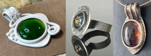 Omdat de smelttemperatuur van glas hoger ligt dan de afbaktemperatuur van zilver kunnen glascabochons perfect samen met zilverklei worden afgebakken. Zorg wel dat je de glascabochons ruimte geeft om uit te zetten. Dit kan door een opening in het zilverklei te maken achter de glascabochon.