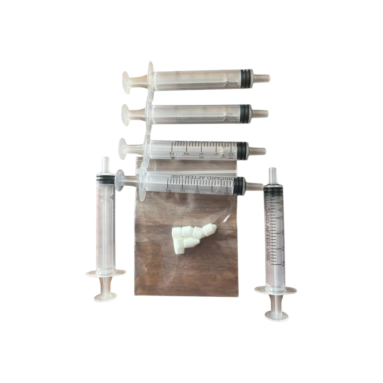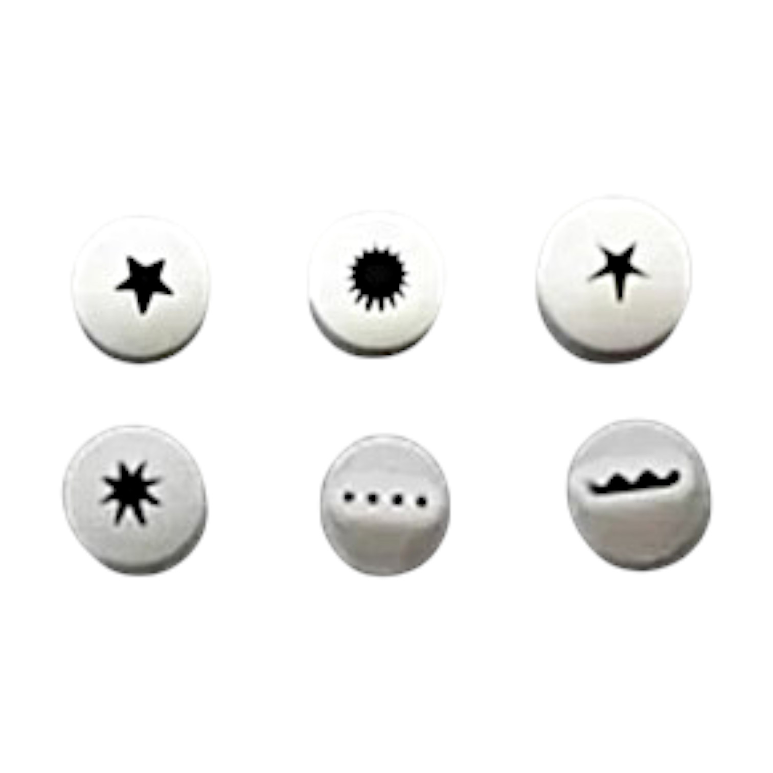 Set met 6 mini spuitjes en 6 verschillende tips om figuurtjes te spuiten van klei.